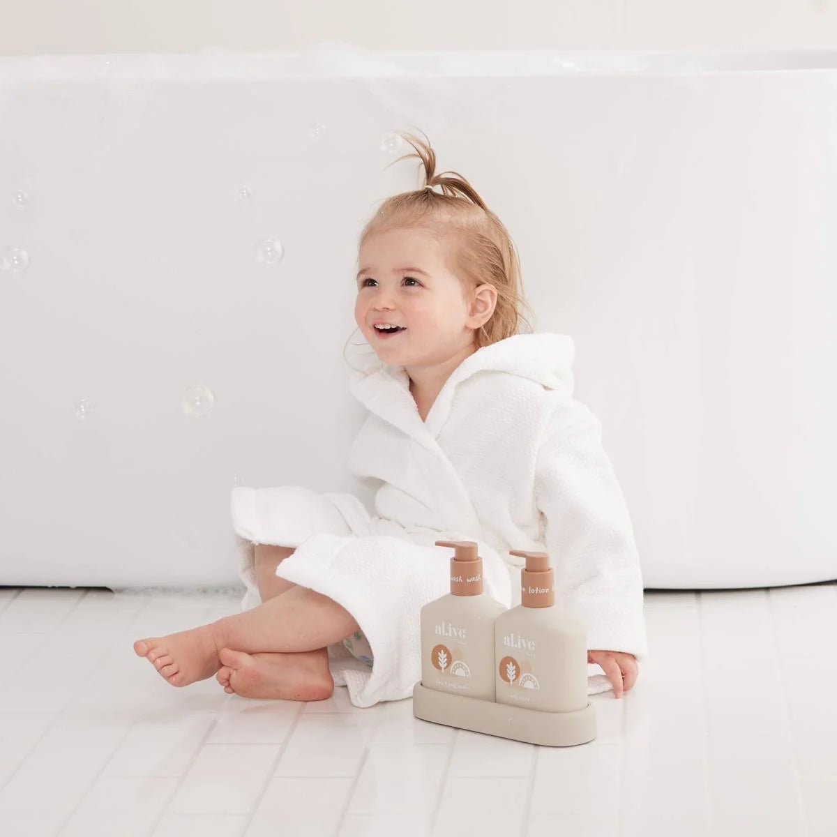 Designed to nurture and protect delicate skin, the Al.ive Baby Hair & Body Duo in Calming Oatmeal includes a Baby Hair & Body Wash and Body Lotion, housed in a non-slip tray with easy-to-pump lids for convenience.