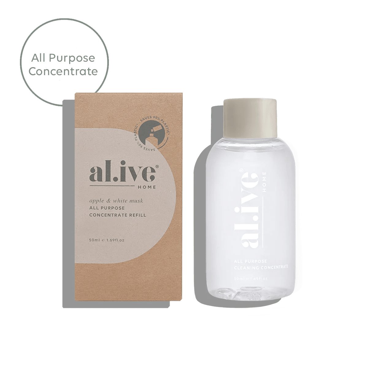 To prepare, pour the 50ml concentrate into your al.ive home All Purpose Refillable Bottle. Slowly add tap water to the 450ml line to prevent foaming, then shake well to activate. You'll be left with a crisp, effective cleanser, delicately scented with refreshing apple and white musk.
