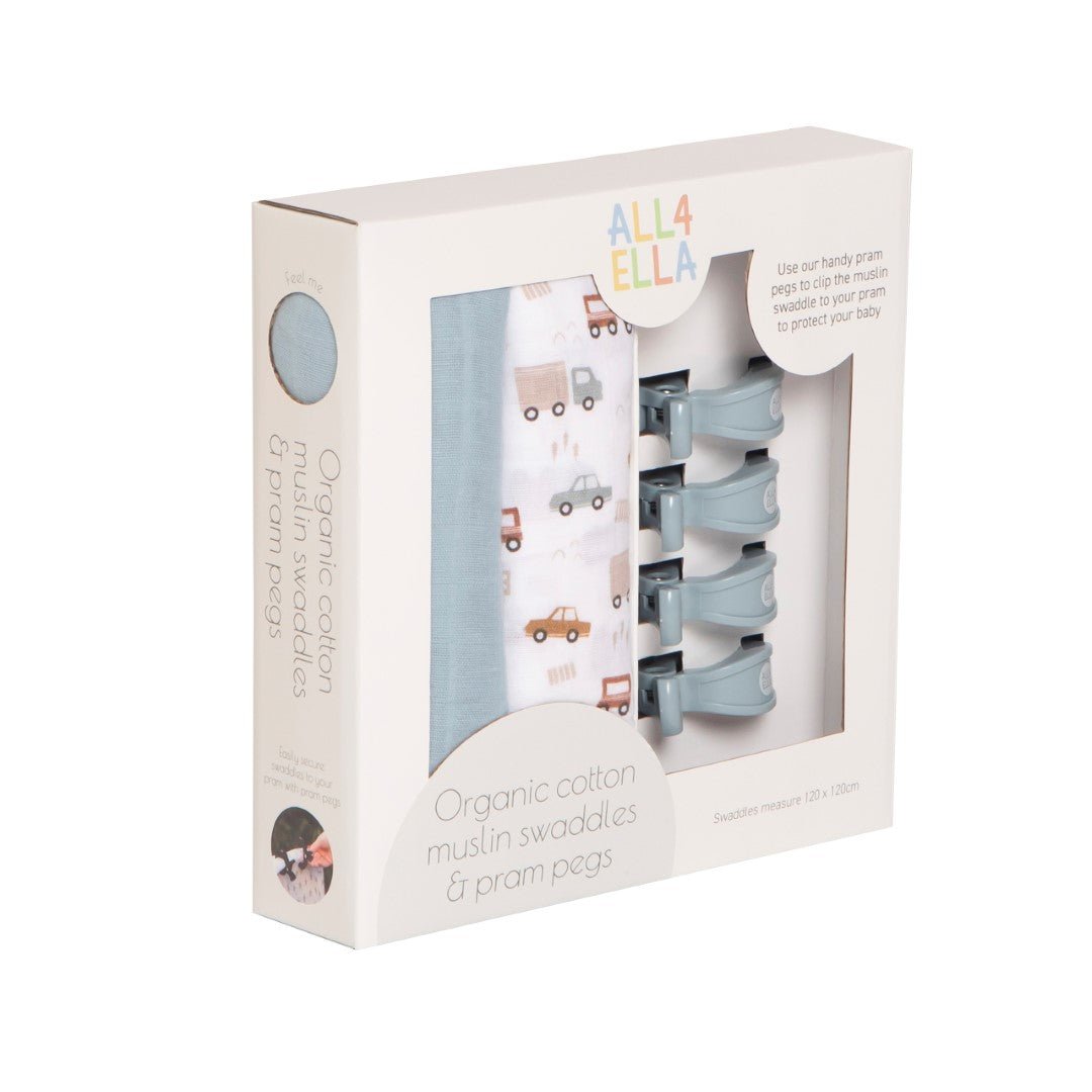 Trucks 2pk Organic Swaddle & 4pk Pram Pegs Gift Set