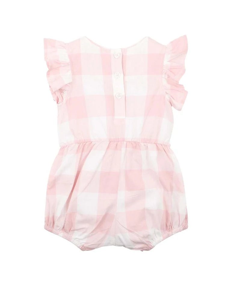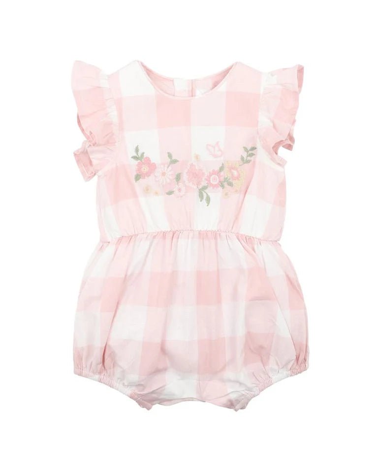 Perfect for a Summer's day this sweet cotton gingham bodysuit features a beautiful floral bouquet embroidery on the front, frilled armholes, piping around neckline, elastic waist for fit and comfort, elasticated legs, back button placket and a press stud crotch opening for ease of dressing.