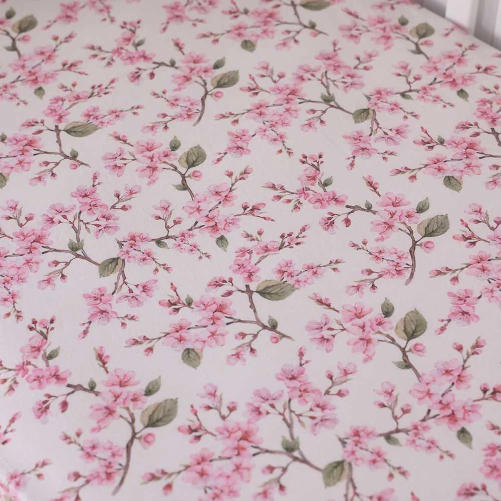 Our Snuggle Hunny Cherry Blossom Fitted Cot Sheet is made from snuggly soft organic stretch cotton jersey. It is stretchy so fits most cot mattress sizes and comes in a matching drawstring bag.
