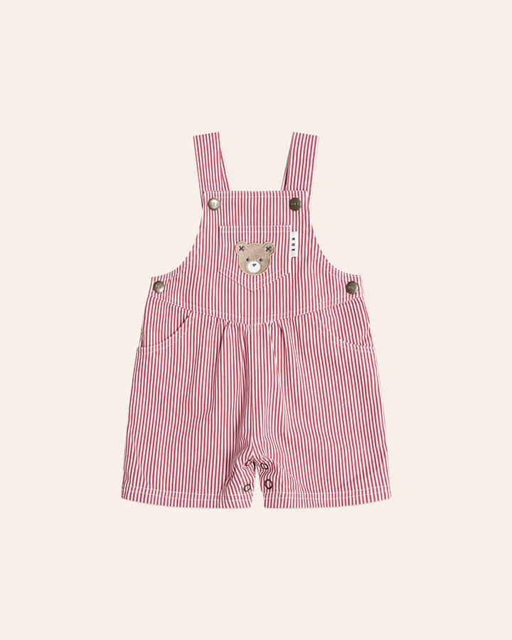 A reimagined classic in merry red pinstripe, these cotton twill overalls bring vintage cool to holiday dressing. Soft and breathable with adjustable straps for a just-right fit, they feature chest and side pockets ideal for stashing candy canes (or tiny treasures). Finished with iconic Huxbear embroidery for a signature touch. Baby sizes include stainless steel crotch snaps for easy changes.