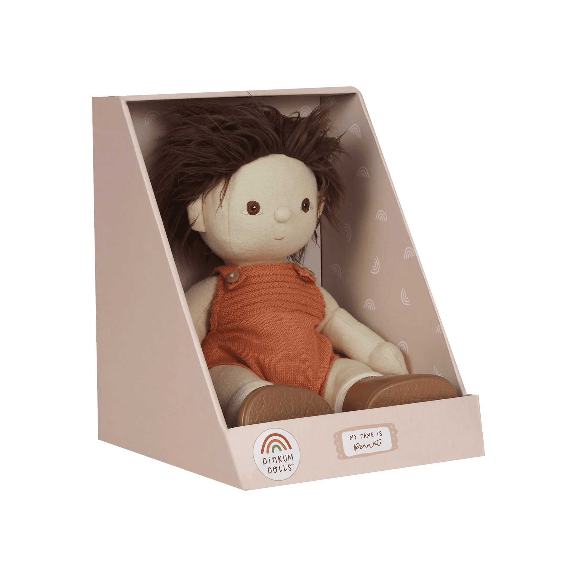 Bring home Peanut, one of the charming Dinkum Dolls by Olli Ella. Fashioned from buttery-soft cotton, with posable limbs and sweet embroidered features, Peanut comes fully dressed in a removable gender-neutral romper, socks, nappy & shoes. Standing at 35 cm (~14″) and weighing just 0.4 kg, Peanut is easy to hold and perfect for cuddles. Suited for nurturing play—designed for kids aged 3+ (with supervision from 18 months). Spot clean or machine wash gently inside a pillowcase. Packaged beautifully—complete with a personalized letter and gift-ready styling. A portion of all sales supports Save the Children.