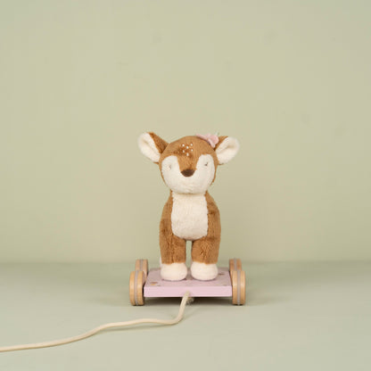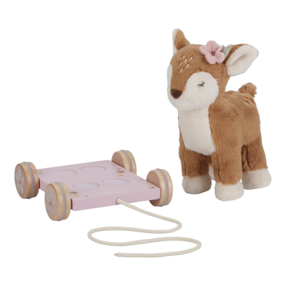 Bring the deer along! Pull the rope and go on an adventure together. The deer will follow you through the magical Fairy Garden, where the most beautiful flowers grow, and little fairies sing and dance. The soft and cuddly deer of this pull-along toy stands on a pink wooden carriage decorated with flowers. With the little string, your little one can guide her through the house and play.