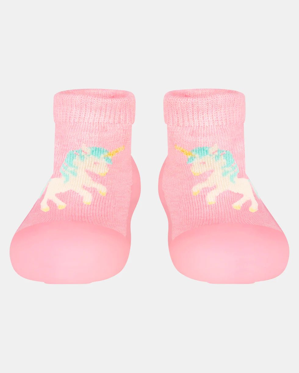 Made with the finest quality certified organic cotton yarn, the inner sock is soft and breathable, offering gentle care for delicate baby feet and peace of mind for eco-conscious parents. A flexible rubber sole cushions each step, enhancing balance and stability, while the skid-resistant grip supports safe and steady movement.