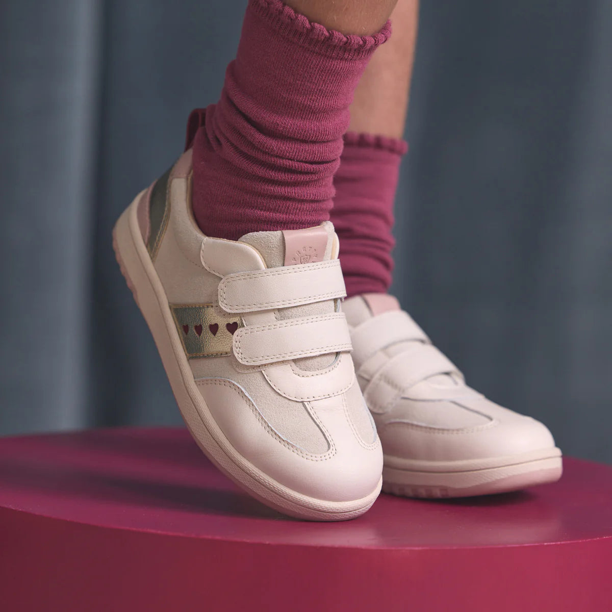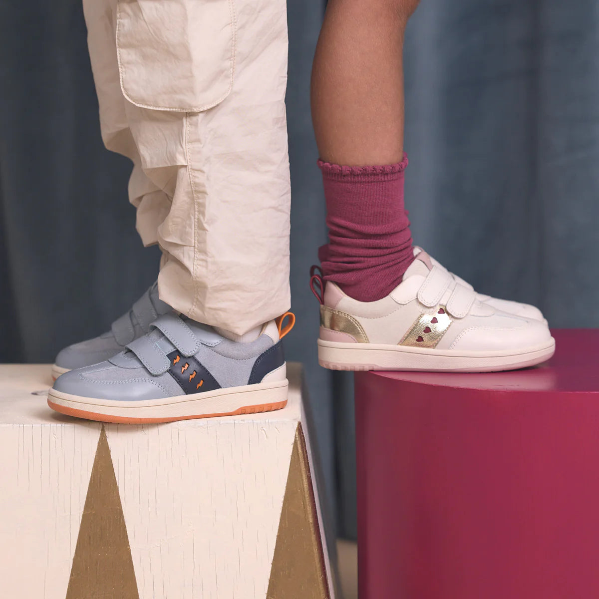 River is a fresh, sporty trainer made to play as hard as they do. Crafted from genuine leather with fun cut-out detailing, River combines supportive design with playful style. Double hook-and-loop straps allow for easy on and off, while a padded collar and cushioned insole deliver all-day comfort. Finished with a reinforced toe cap for extra durability, this podiatrist-approved style is made for action - ready to run, jump and explore.